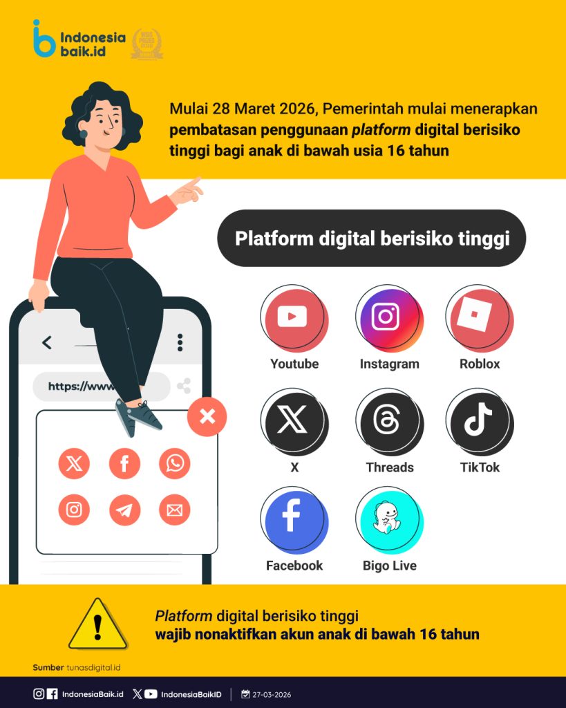 Mulai 28 Maret 2026, pemerintah akan menerapkan pembatasan penggunaan platform digital berisiko tinggi bagi anak di bawah usia 16 tahun.